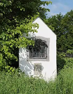 Sa minuscule façade est percée d'une grande niche en pierre bleue (petit granit) au linteau monolithe bombé, fermée d'une grille en fer forgé[1].