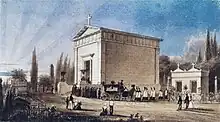 Façade de la chapelle du Père-Lachaise, à gauche (à droite, le monument Thiers). | |
