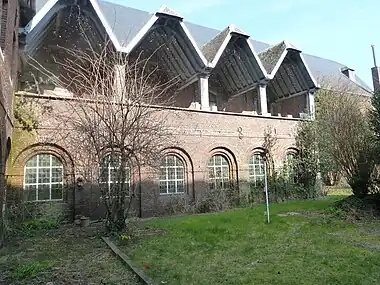 Derrière le cloître, le site comprenait le quartier des Convers, une brasserie, de nombreuses dépendances, ainsi qu'un jardin avec des arbres fruitiers. Toute cette partie du site se transforma petit à petit dans le courant du XIXe siècle. D'abord, l'aménagement en 1840 de la rue de la station, pour pouvoir relier la gare à la ville, fit disparaître tout le jardin. Ensuite, les Hospices civils décidèrent de raser les dépendances du couvent en 1865. En effet, grâce à la générosité d'Henri-Joseph Rey, ils purent édifier un nouvel hospice correspondant aux normes sanitaires de l'époque. Nommé « l'Hospice Rey », ce vaste bâtiment pour le soin des malades fut détruit à son tour en 1970 pour faire place à la crèche actuelle du CPAS. Aujourd'hui, seul un petit bâtiment rectangulaire du XVIIe siècle a été conservé. Celui-ci a servi de quartier des Convers sous l'époque des Dominicains et puis de dépendance à l'hospice comme buanderie, lavoir et logement à l'aumônier. De 1971 et jusque dans le milieu des années 1990, il a abrité le musée communal avant de se retrouver sans toiture et en état de ruine.