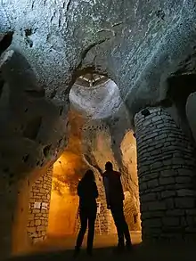 Cette chapelle troglodytique était à l’origine une ancienne carrière d'extraction de falun datant du XIIIe siècle ; en levant les yeux on peut apercevoir au sommet la grande ouverture qui est un ancien puits d'extraction. Il permettait de monter la roche à la surface grâce à des treuils. Les trous en ligne situés en dessous sont les trous d'échafaudage[2].