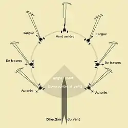 - angle mort : il n'est pas possible d'avancer face au vent, sauf pendant un court moment en cours de virage.