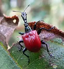 Le Charançon girafe se nourrit de feuilles de melastomes, et plus précisément des espèces Dichaetanthera cordifolia et Dichaetanthera arborea.