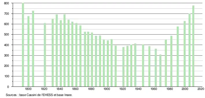L'évolution du nombre d'habitants est connue à travers les recensements de la population effectués dans la commune depuis 1793. À partir du , les populations légales des communes sont publiées annuellement dans le cadre d'un recensement qui repose désormais sur une collecte d'information annuelle, concernant successivement tous les territoires communaux au cours d'une période de cinq ans. Pour les communes de moins de 10 000 habitants, une enquête de recensement portant sur toute la population est réalisée tous les cinq ans, les populations légales des années intermédiaires étant quant à elles estimées par interpolation ou extrapolation[15]. Pour la commune, le premier recensement exhaustif entrant dans le cadre du nouveau dispositif a été réalisé en 2005[16],[Note 2].