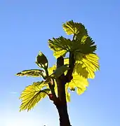 - Feuilles adultes orbiculaires, entières ou à 5 lobes, sinus pétiolaire ouvert à fond souvent limité par la nervure près du point pétiolaire (caractéristique majeure pour le distinguer du pinot blanc B), dents courtes rectilignes et un limbe bullé.