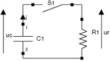 Soit la capacité du condensateur, la résistance, la tension aux bornes du générateur (non représentée sur le schéma ci-dessus) et la tension aux bornes du condensateur en fonction du temps. Soit où est la constante de temps du circuit[1].