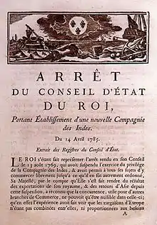 - La mise en œuvre des réformes boursières de Calonne permet d'éviter un krach boursier[9]. Les capitaux propres de la Compagnie des Indes sont doublés, celle-ci étant recréée le avec un capital de 20 millions de livres. Les opérations à terme sont interdites et le dividende de la Caisse d'Escompte est réglementé, son calcul devant tenir compte des bénéfices du semestre.