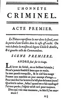 - L'Honnête Criminel, ou l'Amour filial, drame en 5 actes et en vers, publiée en 1767 et jouée à Paris, chez M. de Villeroy, Comédiens français, ; Paris, Théâtre de la Cour, Comédiens ordinaires du Roi, . Texte en ligne