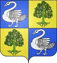Écartelé : aux premier et quatrième, d'azur, à un cygne d'argent ; aux deuxième et troisième, d'or, à un chêne arraché de sinople, englanté d'argent[56],[80].