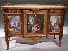- Commode de Madame du Barry attribué à Martin Carlin, vers 1772. Deux plaques de porcelaine : d'après le tableau Par une tendre chansonnette de Nicolas Lancret (1690-1743) gravé par Charles-Nicolas Cochin, ornant le côté gauche ; L'Agréable société, avant 1772, d'après une œuvre de Jean-Baptiste Pater (1695-1736) gravée par Filloeul, au centre de la commode ;