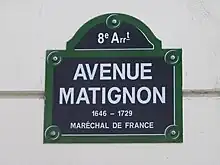 L’avenue Matignon du 8e arrondissement de Paris perpétue le souvenir de ce maréchal.