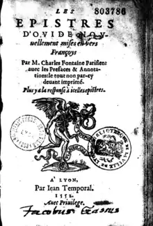 On peut noter que c’est à cette époque que Fontaine se positionne par rapport à la Pléiade, notamment par le soutien et la proximité qu’il entretient avec Guillaume Des Autels. Il se rapproche d’autres éditeurs pendant cette période, comme Jean Temporal chez lequel il fait paraitre en 1552 une traduction des élégies d’Ovide (1552 et 1556), sous le titre Les Epistres d’Ovide nouvellement mises en vers Françoys par M. Charles Fontaine Parisien pour laquelle il a obtenu un privilège en son nom. Obtenir le privilège un privilège en son nom est chose peu commune à cette époque et peu une nouvelle fois faire valoir la notoriété de Fontaine[24].