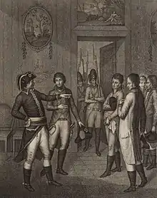 - « Voulez-vous obéir à la Convention ? dit Camus.— Non. — Eh bien ! vous êtes suspendu de vos fonctions, vos papiers vont être saisis et votre personne est arrêtée. — C’est trop fort, s'écrie Dumouriez ; à moi ! hussards ! »