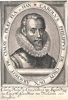 Charles de Croÿ était aussi prince de Chimay, comte de Beaumont, de Seninghem, de Porcéan, seigneur d'Halluin et de Comines, vicomte de Nieuport.