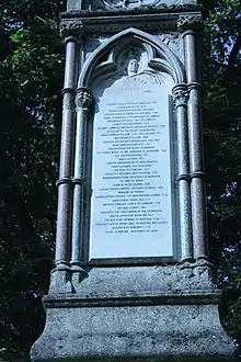 Fermé aux sépultures en 1850, le cimetière de St Pancras Old Church, où de nombreux catholiques et émigrés français ont été enterrés, est désaffecté en 1865 en raison des travaux de la gare de Saint-Pancras, terminus des Midland Railway, puis rouvert comme parc public en [70],[76]. La baronne Angela Burdett-Coutts fait alors construire un mémorial, inauguré en 1879, qui porte depuis son nom.