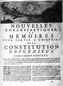 En septembre 1713, le pape Clément XI publie la bulle Unigenitus à la demande de Louis XIV, afin de contrer les thèses de Pasquier Quesnel. Par crainte de déplaire au roi[c 1], Charles de Caylus accueille la bulle favorablement et la publie dans son diocèse le 28 mars 1714[4],[f 3]. À l'inverse, le cardinal de Noailles et quelques évêques, s'opposant à la fois au pape et au roi, refusent d'accepter la bulle.