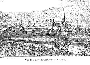 En 1768, sous la direction du père Dom Jean Azam, la maison haute (cloître, église, mur d'enceinte) de la chartreuse occupait déjà le territoire qu'elle occupe encore de nos jours, même si celle-ci a entièrement été reconstruite au XIXe siècle[26]. Dom Gabriel Morel est nommé prieur de Glandier le .