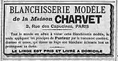 En 1901, Charvet ouvrit une blanchisserie au no 3, rue des Capucines, à côté de son magasin, qu'un journaliste américain affirme être la première à avoir été ouverte à Paris[101], ce fait ayant conduit certains auteurs à croire que l'activité de blanchisseur avait, pour Charvet, précédé celle de chemisier[102]. La publicité de la blanchisserie affirmait qu'y étaient appliqués les principes de Pasteur et de Grancher[103],[104]. En 1903, Charvet transféra sa « blanchisserie modèle »[105] place du Marché-Saint-Honoré, dans des locaux appartenant à la Ville de Paris, après accord de cette dernière eu égard à un procédé novateur à base d'ozone[106], dont la licence fut ensuite donnée aux hôpitaux parisiens[107]. Le linge sale, enlevé chez le client par des « voitures spéciales »[108] à caisse jaune[109], était désinfecté et blanchi à l'ozone, puis essangé à l'eau froide dans des tambours mus à l'électricité[110], trempé dans une solution diastasique pour ôter l'amidon et blanchir le lin, lavé à la main à l'eau, rincé dans une solution d'ammoniaque pour ôter le savon, puis azuré, essoré, séché, empesé, repassé et éventuellement cylindré[111]. Outre « l'antisepsie scientifique » que permet le traitement à l'ozone, le journaliste Arnaud-Moulin relève « une supériorité évidente [...] dans l'apprêt du linge », qu'il soit mat ou miroitant[109]. La blanchisserie s'étend sur deux niveaux : au rez-de-chaussée, l'atelier du marquage, puis celui des barboteuses et essoreuses ; au premier étage, l'atelier d'amidonnage et celui de repassage[112]. Le procédé était considéré comme « modèle », tant au point de vue de la qualité du résultat[113] que pour le soin de la santé des ouvrières[110]. Une quantité « surprenante » de linge était envoyée par des clients britanniques[105],[109]. Comme de nombreux autres clients étrangers[114], William Halsted[115],[116] et William H. Welch[117] envoyaient régulièrement leur linge à Charvet pour le blanchir[n. 9]. Des timbres publicitaires furent également produits pour la blanchisserie, qui devinrent ensuite recherchés des collectionneurs[100]. En 1906, une succursale de la blanchisserie fut ouverte au 1, rue du Colisée, près des Champs-Élysées[119]. Durant la Première Guerre mondiale, Charvet réduisit sensiblement ses tarifs de blanchisserie pour garder du travail à tous ses employés[120] En 1917, la pénurie de charbon réduisit significativement l'activité de blanchisserie de Charvet[n. 10], qui employait alors 400 personnes[123]. La « blanchisserie modèle » cessa son activité en 1933, lors de la restructuration de la place du marché Saint Honoré[124].