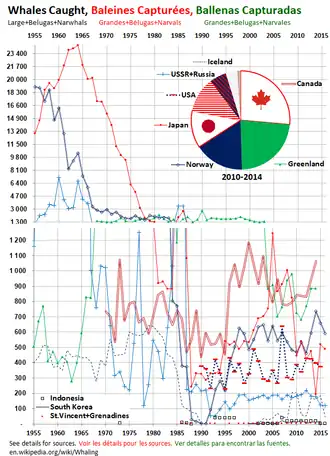 L'Australie et la Nouvelle-Zélande, farouches défenseurs du moratoire, aux côtés d'autres pays tels la France, les États-Unis et le Royaume-Uni ont dénoncé avec virulence ces votes qu'ils considèrent obtenus en échange d'aides financières. Le Japon observe le moratoire, mais effectue, tout comme l'Islande, des pêches de baleines pour la « recherche scientifique », très contestée par les écologistes. La Norvège a pris le parti d'ignorer le moratoire. Ces trois pays ont prélevé 1 500 baleines en 2009[15], 1 179 en 2013[16],[17].