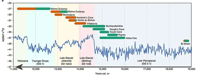 On pense que les WHG eux-mêmes se sont formés il y a environ 14 000 ans, pendant l’interstade Bølling-Allerød, au moment de la première grande période de réchauffement après la période glaciaire. Ils représentent un changement majeur de population en Europe à la fin de la période glaciaire, probablement une expansion de population vers l'Europe continentale, à partir de refuges situés dans le sud-est de l'Europe ou de l'Asie occidentale[4]. On pense que leurs ancêtres se sont séparés des Eurasiens de l'Est vers 40 000 AP et des anciens Eurasiens du Nord (ANE) avant 24 000 AP (date d'âge estimée du « garçon de Mal'ta »). Cette date a ensuite été repoussée plus loin dans le temps par les découvertes du site préhistorique de Yana, daté environ de 38 000 ans, peu de temps après la divergence des lignées d'Eurasie occidentale et d'Eurasie orientale[1],[5]. Vallini et al. (2022) soutient que les modèles de dispersion et de division des lignées d'Eurasie occidentale n'étaient pas antérieurs à 38 000 ans, avec des spécimens européens plus anciens du Paléolithique supérieur initial, tels que ceux de Zlatý kůň (en), de Peștera cu Oase et de la grotte de Bacho Kiro, n'ayant aucun lien avec les chasseurs-cueilleurs de l’Ouest mais étant plus proches des anciens Eurasiens de l'Est ou basaux des deux[6]. Les WHG montrent une plus grande affinité pour les populations anciennes et modernes du Moyen-Orient par rapport aux Européens du Paléolithique antérieur tels que les Gravettiens. L'affinité pour les anciennes populations du Moyen-Orient en Europe a augmenté après le dernier maximum glaciaire, en corrélation avec l'expansion de l'ascendance WHG (Villabruna ou Oberkassel). Il existe également des preuves d'un flux génétique bidirectionnel entre les populations de WHG et du Moyen-Orient dès 15 000 ans AP. Les restes associés aux WHG appartiennent principalement aux haplogroupes du chromosome Y humain I-M170 avec une fréquence plus faible de C-F3393 (en particulier le clade C-V20/C1a2), qui a été trouvé couramment parmi les vestiges européens du Paléolithique antérieur tels que Kostenki-14 (en) et du site préhistorique de Sungir. L'haplogroupe paternel C-V20 est encore présent chez les hommes vivant dans l'Espagne moderne, attestant de la présence de longue date de cette lignée en Europe occidentale. Leurs chromosomes mitochondriaux appartenaient principalement à l'haplogroupe U5[7],[8].