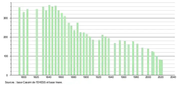 L'évolution du nombre d'habitants est connue à travers les recensements de la population effectués dans la commune depuis 1793. Pour les communes de moins de 10 000 habitants, une enquête de recensement portant sur toute la population est réalisée tous les cinq ans, les populations légales des années intermédiaires étant quant à elles estimées par interpolation ou extrapolation[15]. Pour la commune, le premier recensement exhaustif entrant dans le cadre du nouveau dispositif a été réalisé en 2008[16].