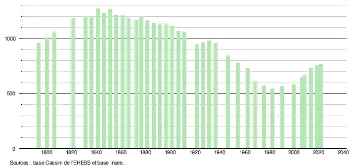 L'évolution du nombre d'habitants est connue à travers les recensements de la population effectués dans la commune depuis 1793. Pour les communes de moins de 10 000 habitants, une enquête de recensement portant sur toute la population est réalisée tous les cinq ans, les populations légales des années intermédiaires étant quant à elles estimées par interpolation ou extrapolation[18]. Pour la commune, le premier recensement exhaustif entrant dans le cadre du nouveau dispositif a été réalisé en 2008[19].