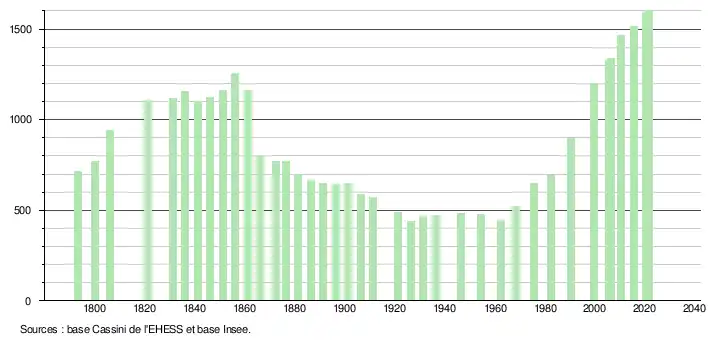 L'évolution du nombre d'habitants est connue à travers les recensements de la population effectués dans la commune depuis 1793. Pour les communes de moins de 10 000 habitants, une enquête de recensement portant sur toute la population est réalisée tous les cinq ans, les populations légales des années intermédiaires étant quant à elles estimées par interpolation ou extrapolation[17]. Pour la commune, le premier recensement exhaustif entrant dans le cadre du nouveau dispositif a été réalisé en 2005[18].
