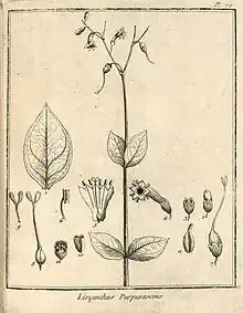À leur extrémité les rameaux ſe partagent en deux petites tiges, ſur chacune deſquelles ſont placées cinq à ſix fleurs, de couleur purpurine, qui d'abord ſont droites, & s'inclinent à meſure qu'elles s'épanouiſſent.
