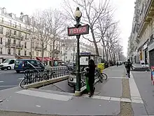 La station dispose de deux accès, chacun constitué d'un escalier fixe orné d'une balustrade et d'un candélabre de type Dervaux :