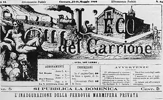 Un prolongement d'une dizaine de kilomètres vers les aires d'excavation (carrières de Gioia, Ravaccione-Polvaccio, Colonnata) est proposé, en 1885, par les ingénieurs Sartorio et Leoni. Les travaux commencent en 1887 et le nouveau tronçon est inauguré le . Avec cette extension, le chemin de fer diminuait sensiblement le temps et le coût de transport des marbres vers la mer et représentait la première alternative mécanisée aux anciennes méthodes de transport des blocs de marbre, qui historiquement étaient descendus des apuanes par les vie di lizza puis tirés par des bœufs vers la plaine.
