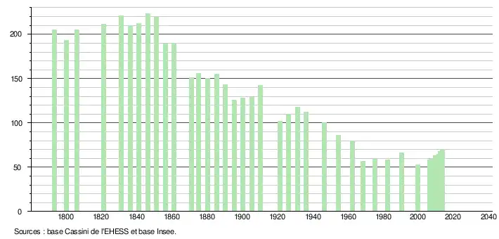 L'évolution du nombre d'habitants est connue à travers les recensements de la population effectués dans la commune depuis 1793. Pour les communes de moins de 10 000 habitants, une enquête de recensement portant sur toute la population est réalisée tous les cinq ans, les populations légales des années intermédiaires étant quant à elles estimées par interpolation ou extrapolation[17]. Pour la commune, le premier recensement exhaustif entrant dans le cadre du nouveau dispositif a été réalisé en 2008[18].