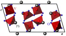 Les cations Pb2+ sont distribués sur deux sites non-équivalents : Pb1 est entouré par 8 anions O2−, Pb2 par 9 anions O2−, avec une longueur de liaison Pb-O moyenne de 2,72 Å. Les cations V5+, distribués sur deux sites non-équivalents, sont en coordination tétraédrique déformée d'O2−, avec une longueur de liaison V-O moyenne de 1,75 Å. Les tétraèdres VO4 sont reliés entre eux par un sommet et forment des dimères isolés V2O7.