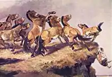 Cette théorie très populaire, dont il n’a jamais été question dans les publications scientifiques de Henry Testot-Ferry, apparaît dans le roman préhistorique d’Adrien Arcelin intitulé Solutré ou les chasseurs de rennes de la France centrale, en 1872. Il s'agit d’une fiction dont l’imaginaire populaire s’est emparé[21]. Illustrée d'une très riche iconographie[22], elle est reprise des dizaines de fois par des auteurs, cinéastes et artistes malgré son impossibilité, prouvée dès les années 1960 par la configuration du terrain[23].