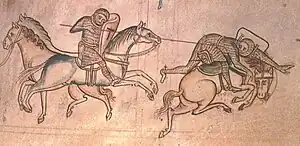 À l'origine, la chevalerie n'est pas exclusivement synonyme de noblesse, mais elle en devient l'expression de sa force armée au cours du second Moyen Âge. Avant le XIe siècle, la plupart des grands seigneurs et princes mènent sur le champ de bataille leurs guerriers, et ne s'intitulent pas eux-mêmes chevaliers. Cette dénomination apparaît plus tardivement, traduisant une militarisation de la société, ainsi que la mise en valeur accrue de la fonction guerrière et l'essor de la chevalerie[46]. Pour le philosophe et alors pressenti évêque de Chartes, d'origine anglaise, Jean de Salisbury (v. 1115-1180), les chevaliers sont les « mains armées » du prince : ils doivent combattre pour faire régner son ordre sur ses terres[46].