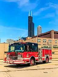 Une caractéristique unique du Chicago Fire Department est le gyrophare vert qui se trouve généralement à l'avant droit des véhicules[30], en plus de tous les gyrophares rouges et blancs que l'on trouve habituellement (voir la première image ci-contre, la cabine de camion vue de face).