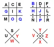 - Des symboles plus précis que les points (ou plusieurs points) peuvent être utilisés pour distinguer plusieurs grilles de même taille[4],[5] (par exemple dans le chiffre dit des templiers, qui utilise uniquement des grilles 2×2).