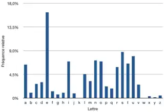 Une autre attaque possible est de faire une analyse de fréquence d'apparition des lettres : on génère un graphique sur la fréquence d'apparition de chaque lettre dans le texte chiffré et un autre avec un texte de référence, dans la langue du message d'origine, et on explore par décalages successifs toutes les possibilités. En les comparant, un humain peut facilement voir la valeur du décalage entre ces deux graphiques, et trouver la clé de chiffrement. Cette technique s'appelle l'analyse fréquentielle. Par exemple, en anglais, les lettres E et T sont les plus fréquentes et les lettres Q et Z, les moins fréquentes[19]. Des ordinateurs peuvent aussi faire ce travail de reconnaissance en évaluant la concordance de distribution des deux textes (le texte chiffré et celui de référence) en utilisant, par exemple, une fonction test du χ² de Pearson[20].