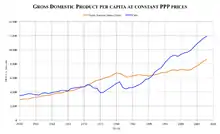 La crise de 1982-1983 signe l'arrêt momentané du « miracle chilien »[55]. Les salaires réels, jusque-là indexés à l'inflation, diminuent de 10 %[56] et se situent 30 % en dessous de leur niveau de 1970[57] ; le chômage atteint 30 %, la pauvreté augmente, et les inégalités s'accroissent. À la fin des « années Pinochet », 20 % de la population se partage 80 % de la richesse du pays[58]. Pendant toute la durée de la dictature, la consommation moyenne par habitant n'a jamais retrouvé son niveau de 1972, et on observe une « diminution de la qualité de vie d'une partie importante de la population chilienne »[59]. Cependant, en parité de pouvoir d'achat, le PIB par habitant s'est accru de 50 % entre 1974 et 1990, sous la présidence de Pinochet, puis a doublé entre 1990 et 2005.
