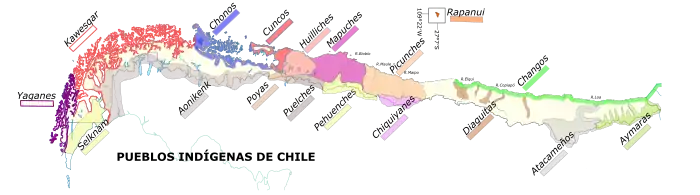 Côté Pacifique, différentes cultures et peuples coexistaient : Aymaras, Changos, Chinchorros, Atacamas et Diaguitas dans le Nord ; Picunche, Mapuche, Huilliche et Pehuenche dans les régions centrale et méridionale ; et Chonos, Onas, Yaganes et Alakalufs dans la Patagonie et la Terre de Feu. Les Mapuche représentent le plus grand groupe ethnique.
