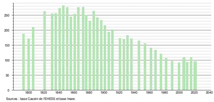 L'évolution du nombre d'habitants est connue à travers les recensements de la population effectués dans la commune depuis 1793. Pour les communes de moins de 10 000 habitants, une enquête de recensement portant sur toute la population est réalisée tous les cinq ans, les populations légales des années intermédiaires étant quant à elles estimées par interpolation ou extrapolation[14]. Pour la commune, le premier recensement exhaustif entrant dans le cadre du nouveau dispositif a été réalisé en 2005[15].