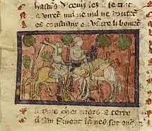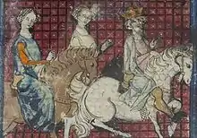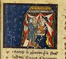 Le meurtre de Galswinthe par Chilpéric Ier dans les Grandes Chroniques de France de Charles V, vers 1375-1380 (Bibliothèque nationale de France, département des manuscrits, ms. Français 2813, fo 31 ro). | |