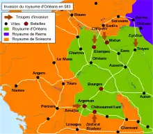 Chilpéric ne tient pas compte de ces décisions. Au contraire, en 572, il envoie son fils Clovis s'emparer des cités de Tours et de Poitiers afin d'assurer la continuité entre ses possessions. À Tours, Clovis bénéficie du soutien du comte Leudaste, d'une partie de la population et du clergé[note 5]. Il prend également Poitiers et s'installe à Bordeaux. L'armée de Sigebert, renforcée par des troupes burgondes commandées par le patrice Mummol[85], attaque Chilpéric en Aquitaine et conquiert Limoges et le Quercy. Clovis est chassé de Bordeaux par une révolte fomentée par Sigebert et le duc Sigulf[86] et se réfugie chez son père. Le comte Leudaste, qui s'est également enfui, est remplacé par le comte Justinus[87]. Bordeaux, partie du morgengabe, se retrouve donc en possession de la reine d'Austrasie.