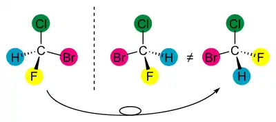 Si une molécule est chirale, elle possède au moins deux formes dites énantiomères qui se différencient par une configuration absolue opposée. Il est nécessaire que tous les éléments asymétriques soient opposés entre une molécule et son énantiomère.
