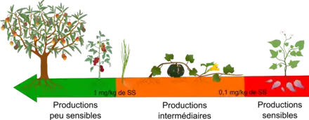 Pour les végétaux, deux valeurs de teneur maximale du sol en chlordécone ont été déterminées afin de garantir la conformité des produits cultivés en fonction de leur sensibilité au transfert. Une denrée est conforme si la teneur du produit commercialisé est inférieure à la Limite maximale de résidus (LMR), fixée actuellement à 20 µg/kg de poids frais[PDF 11]. Les légumes racines peuvent être cultivés sur des sols ne dépassant pas 0,1 mg de chlordécone/kg de sol sec. Les produits ayant une sensibilité intermédiaire (cucurbitacées, salades, cives / oignons pays, etc.) peuvent être cultivés sur des sols contaminés jusqu’à 1 mg·kg-1 de sol sec. Sur les sols contaminés au-delà de 1 mg·kg-1 de sol sec, il est possible de cultiver toutes les productions peu sensibles, essentiellement les fruits et légumes aériens : tomates, haricots verts, bananes, ananas, goyaves, etc.[53].