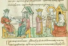 En 945 ou 957, selon les sources, la princesse régente Olga de Kiev vint en visite à Constantinople en compagnie d’un prêtre du nom de Grégoire. Le De Ceremonis conserve la description de l’imposante réception qui lui fut accordée[11]. Selon la légende, l’empereur Constantin VII serait tombé amoureux de la princesse. Celle-ci trouva la façon d’éviter le mariage en demandant à l’empereur d’être son parrain lors de son baptême. Une fois baptisée, elle fit valoir qu’il n’était pas approprié qu’un parrain épousât sa filleule.