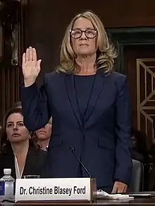 Le , Christine Blasey Ford affirme que Brett Kavanaugh, candidat à la Cour suprême des États-Unis, l'a agressée sexuellement en 1982, dans ce qu'elle décrit comme une tentative de viol alors qu'elle avait 15 ans et lui 17[5]. Le futur juge récuse totalement les affirmations[6]. Les faits se sont déroulés lors d'une soirée de lycée[7]. Avant son audition, elle avoue à un journaliste, « Je ne suis pas ici aujourd’hui parce que je le veux. Je suis terrifiée. Je suis ici parce que j’estime qu’il est de mon devoir civique de vous dire ce qui m’est arrivé lorsque Brett Kavanaugh et moi étions au lycée[8]. » Le , elle est appelée à témoigner devant le Sénat des États-Unis, tandis que la nomination de Brett Kavanaugh est mise en pause le temps des auditions[9]. Les sénateurs républicains tentent de discréditer son témoignage, en faisant intervenir une lettre d'un de ses anciens petits-amis avouant avoir vu Christine Blasey Ford aider, dans les années 1990, une de ses amies à se préparer à passer au détecteur de mensonge[10]. L'audition au Sénat est suivie par près de 20 millions d'Américains[11]. Après son témoignage, elle ne peut plus rentrer chez elle, victime de menaces de mort de la part de partisans de Brett Kavanaugh[12].