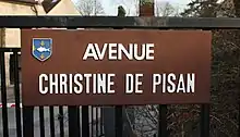- de nombreuses voies : une avenue à Poissy, une rue Christine-de-Pisan dans le 17e arrondissement de Paris[31] ainsi qu'à Bourges, Creutzwald, Guichen, Lisses, Rennes, Saint-Brieuc, Saint-Médard-en-Jalles, Toulouse, Vernouillet, Villepinte, orthographiée « Christine de Pizan » à Évreux et Vitry-sur-Seine, un square à Gravelines, une allée à Bouliac, Bourg-lès-Valence, Carquefou, Montlouis-sur-Loire, Orléans, Saint-Michel-sur-Orge et Saint-Nazaire, et une impasse à Boulazac Isle Manoire, La Roche-sur-Yon et Lavoûte-sur-Loire[32] ;