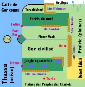 La planète de Gor possède une gravité plus faible que celle de la terre (qui a rendu possible l’apparition de grandes créatures volantes, et a permis de construire dans les villes des grandes tours reliées par des ponts aériens). Elle aurait même pu avoir une gravité encore plus faible si cela n’avait pas été un obstacle pour la technologie des prêtres-rois. La géographie connue de Gor se résume principalement de la côte occidentale d'un continent qui s'étend de l'Arctique au nord jusqu’au sud de l'équateur, avec l'océan Thassa à l'ouest, et la chaîne de montagnes Voltai formant une limite est à toutes les latitudes. Il existe aussi des îles dans l'océan, et des plaines relativement mal connues à l'est de la Voltai. Le mot Gor lui-même désigne la pierre du foyer dans la langue Goréenne (la langue maternelle des cités-états situées dans la région tempérée du nord, et la lingua franca parlée dans de nombreuses autres régions)[7].