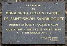- 1794 (26 juillet) : Charles François-Siméon Vermandois de Saint-Simon, dernier évêque d'Agde, est guillotiné à Paris.