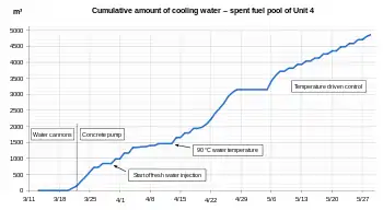 À 19 h 35, l'hélicoptère mobilisé ne peut accomplir sa mission en raison du débit de dose trop important[64] et l'arrosage des piscines de stockage par hélicoptère est abandonné.