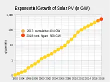 En 2014, la capacité photovoltaïque installée s'est élevée à 40,1 GW, soit une augmentation de 28 % de la puissance installée pour un total de plus de 178 GW. Cette capacité installée permet de couvrir 1 % de la consommation électrique mondiale totale qui s'élève à 18 400 TWh[24],[1]. Jamais auparavant une capacité si importante n'avait été installée au cours d'une année[1]. Par rapport à 2013, cela représente une augmentation de 5 % de la puissance annuelle installée, avec 38,5 GW installés cette année là[23].